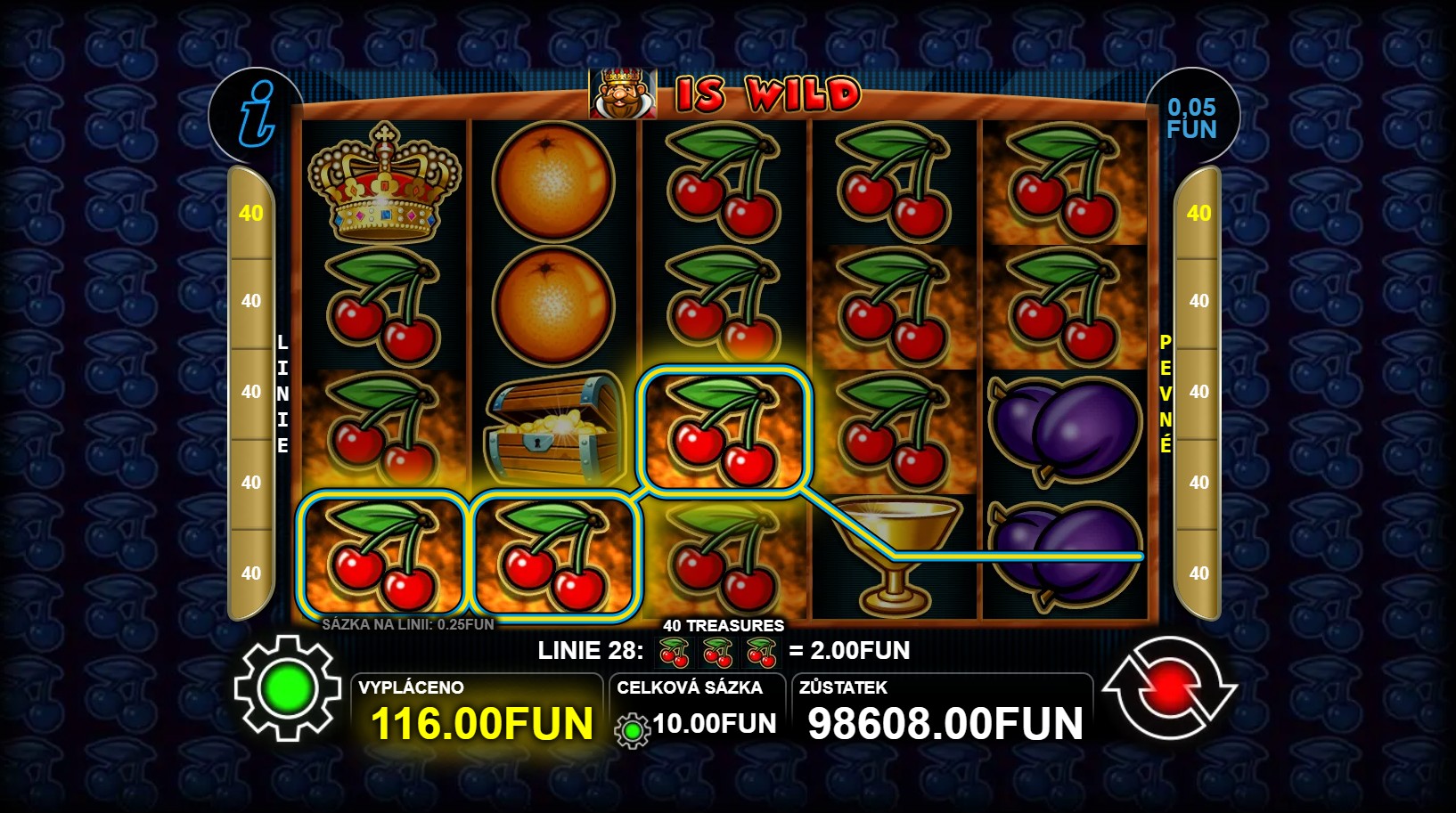 Jediné, co král nezvládne, je nahradit truhly s pokladem, které plní funkci Scatter symbolů. Pokladnice vám výhru vyplácejí všude, nehledě na to, jestli padnou ve výherní řadě.