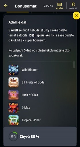 Jakmile protočíte cílovou sumu nejen, že vám dvě stovky přistanou na herní konto, ale také se vám započítá progres z točení v úkolu bonusomatu s názvem „Adell je dál“.