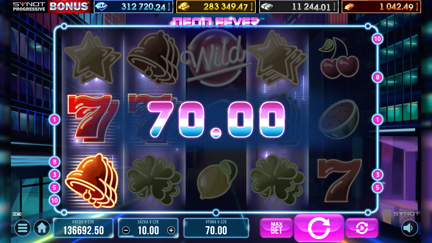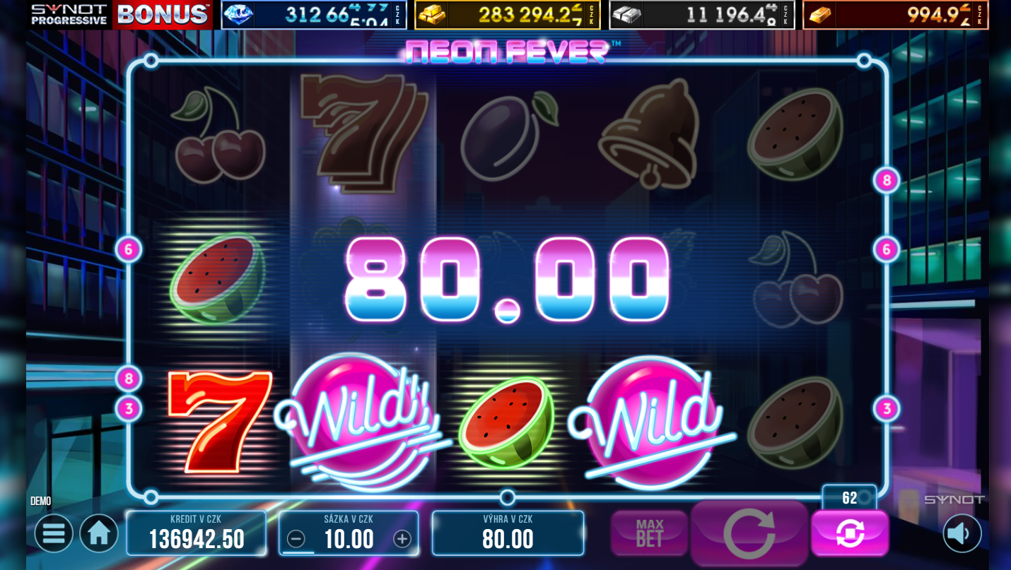 Blikající neony vás dostanou do varu! Zažijte výherní horečku ve hracím automatu Neon Fever od dodavatel her Synot Games.