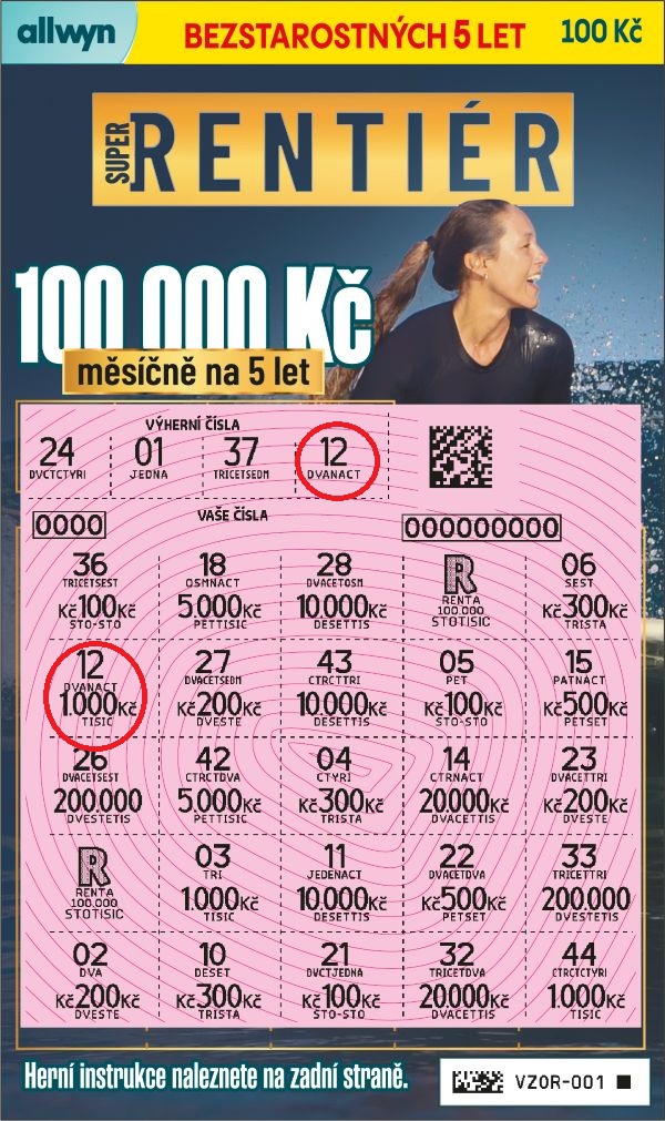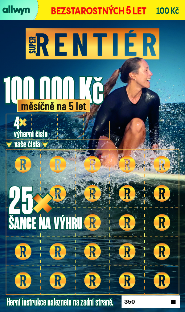 Setřete hrací pole. Pokud se některé VAŠE ČÍSLO shoduje s některým VÝHERNÍM ČÍSLEM, vyhráváte částku uvedenou pod ním. Pokud najdete 3x symbol „R“, vyhráváte měsíční rentu 100 000 Kč na dobu 5 let.