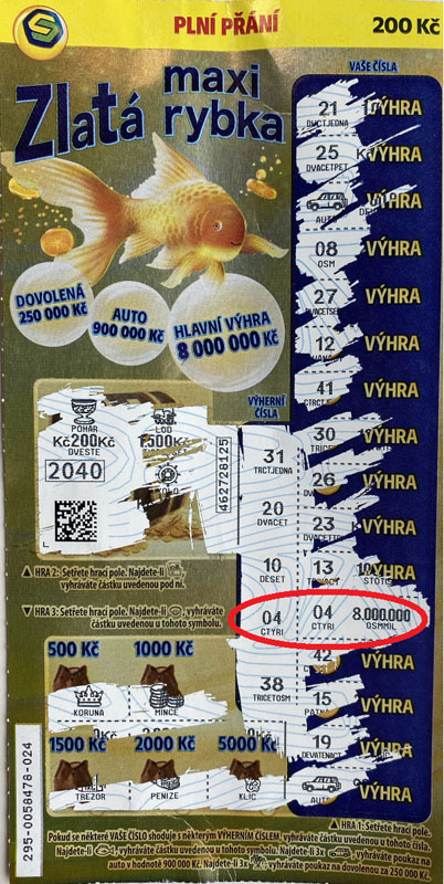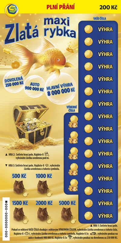 Maxi Zlatá Rybka přinesla opravdu maxi radost jednomu šťastlivci, který setřel číslo 04 a odhalil pod ním nejvyšší možnou výhru – neuvěřitelných 8 000 000 Kč! Tento los za 200 Kč se stal klíčem k splnění těch největších přání. Výherci srdečně gratulujeme a přejeme, ať si s radostí užije tuto fenomenální výhru!