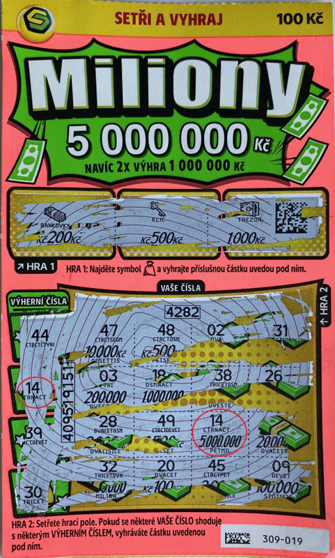 Šťastné číslo 14 se tentokrát postaralo o pořádné překvapení – hlavní výhru v hodnotě neuvěřitelných 5 000 000 Kč! Při stírání muselo být napětí cítit v každém tahu, ale když se toto magické číslo objevilo, mohl výherce začít slavit. Gratulujeme k této fenomenální výhře a přejeme, aby si ji užil naplno!