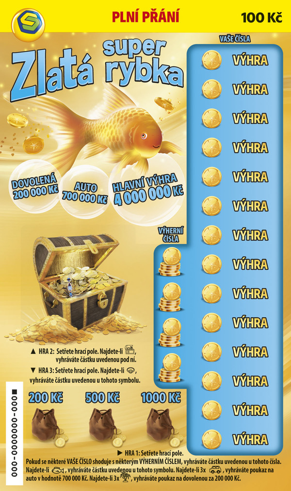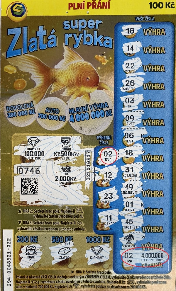 Zlatá super Rybka opět dokázala, že přání plní opravdu ve velkém stylu. Šťastný výherce setřel číslo 02 a hned pod ním našel hlavní výhru – rovných 4 000 000 Kč! Tento los za 100 Kč se proměnil v nezapomenutelný životní moment. Výherci gratulujeme a přejeme, ať výhru užije podle svých snů.